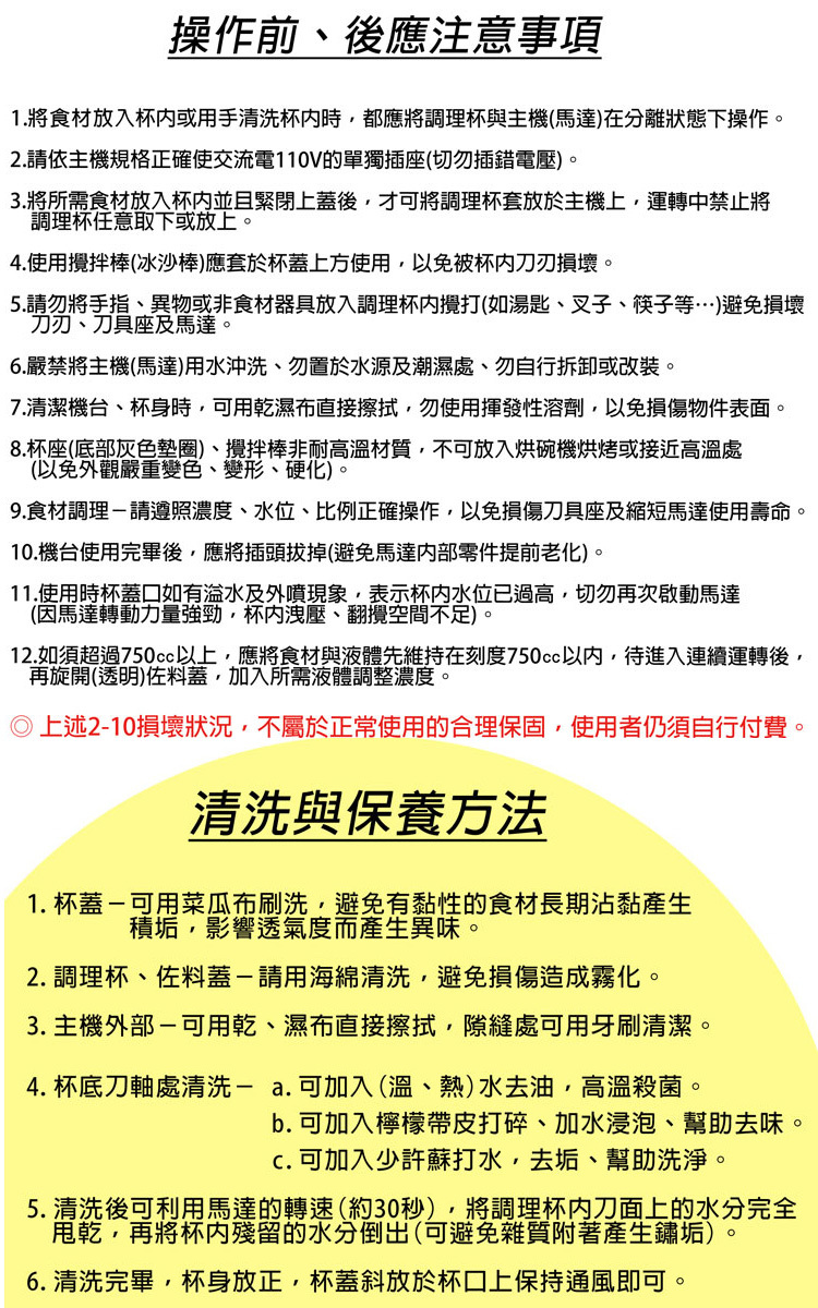 (如湯匙、叉子、筷子、桃子果核、團狀冰塊…等避免零、配件嚴重損壞)